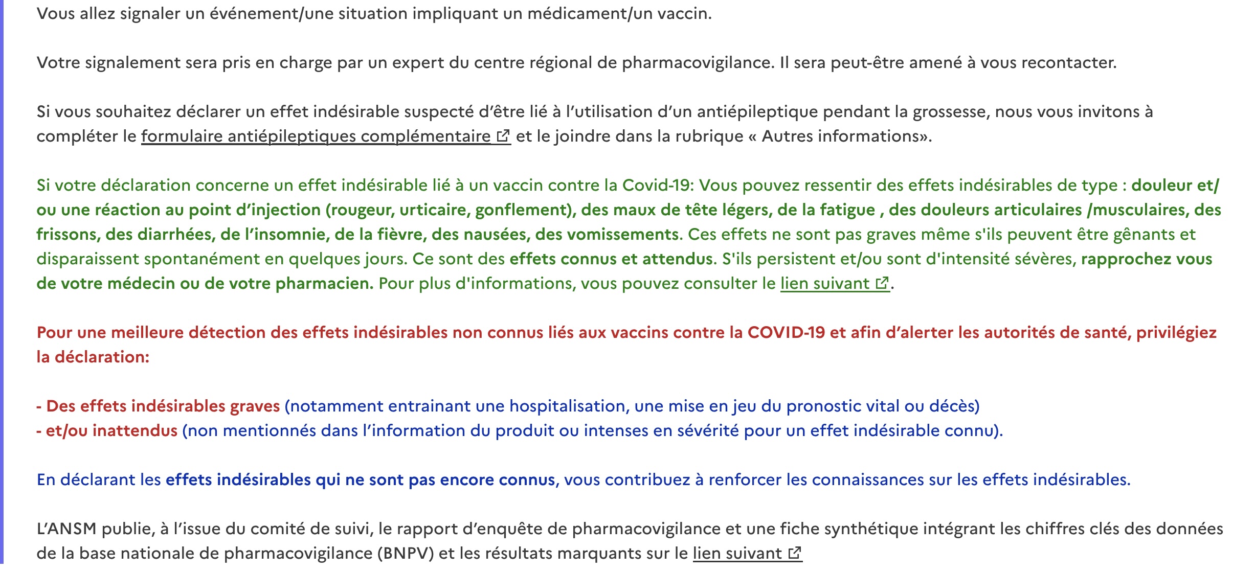 A noter, dès le début du remplissage du formulaire, concernant de possibles effets secondaires liés à l’injection anti-Covid, ce message :